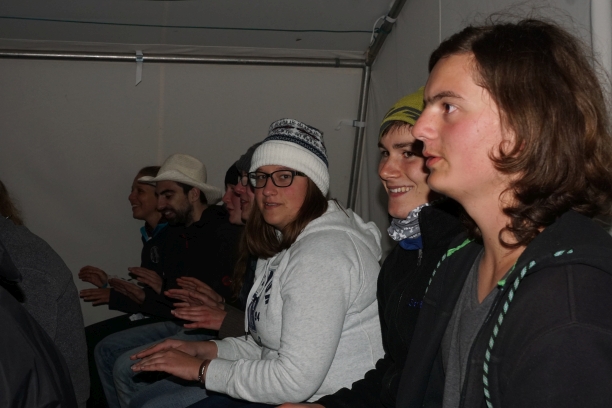 Sobald es draußen dunkel ist, werden im Zelt die Sketches angekündigt