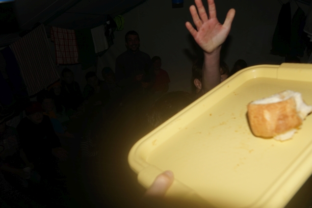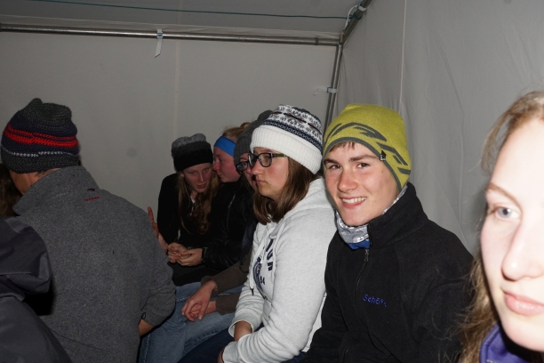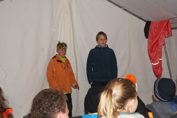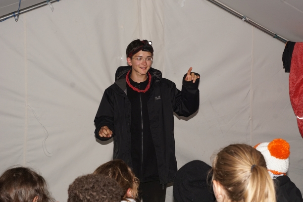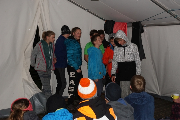Sobald es draußen dunkel ist, werden im Zelt die Sketches angekündigt